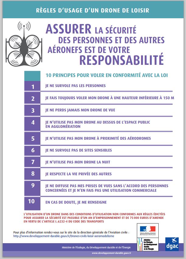 Ce document de deux pages (PDF) résume en 10 points les principes de base (et de bon sens) s’appliquant à tous les petits appareils d’aéromodélisme et souligne qu’en cas d’infraction de la réglementation, le contrevenant s’expose à une peine de 75 000 euros d’amende et un an de prison.