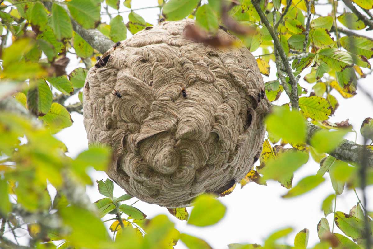 Le frelon asiatique aime la hauteur et la lumière. Il construit souvent ses nids dans des zones exposées : cimes d’arbres, façades, avancées de toits, voire sur des bâtiments. Les nids sont sphériques et peuvent atteindre la taille d’un ballon de basket. Leur ouverture est latérale, dès que le nid dépasse 15 cm de diamètre. C’est une distinction capitale : elle permet de différencier le nid asiatique du frelon européen, dont l’ouverture est orientée vers le bas. En début de saison (février à juin), la reine fondatrice élabore un nid primaire, fréquemment sous un abri, une gouttière ou dans un composteur. Ces petits nids, de la taille d’une balle de golf, annoncent la création d’une colonie. En été, le nid secondaire prend le relais, abritant parfois plusieurs milliers d’individus. Les ouvrières, en quête de protéines, s’attaquent alors à d’autres insectes, notamment les abeilles. D’où l’urgence, comme nous vous en parlions dans cet article, de mettre en place un plan national de lutte coordonnée.