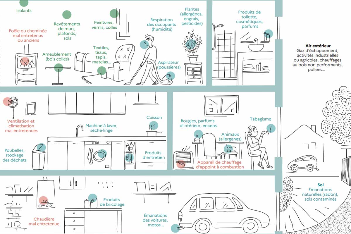Différentes sources de pollution de l’air de votre logement. Crédit photo : Ademe