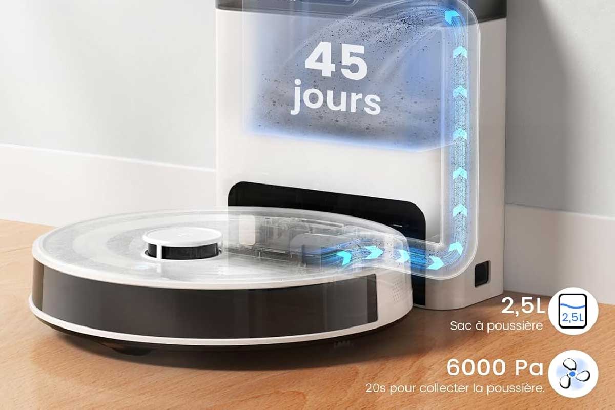 Ce modèle se distingue par sa station de vidage automatique qui limite au maximum le contact avec la poussière. Avec 6 000 Pa d’aspiration, une navigation laser précise et un système de nettoyage personnalisé, il s’adresse clairement aux foyers qui veulent confier l’essentiel de l’entretien des sols à un robot. Il aspire et lave en une seule passe, gère les poils d’animaux sans broncher et sait adapter son comportement à chaque pièce grâce à sa cartographie avancée. Pour un tarif sous les 200 euros pendant le Black Friday, c’est un bon plan robot aspirateur laveur que je trouve difficile à ignorer.