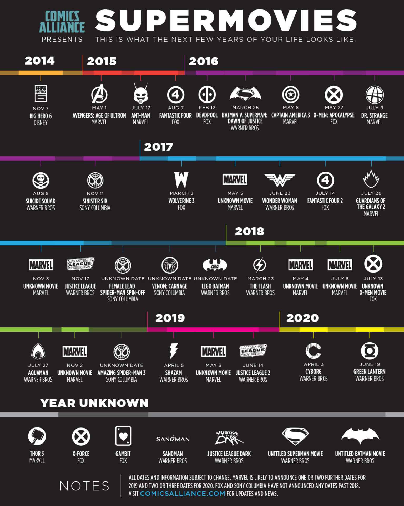 Le calendrier des prochains films de super-héros annoncés vient d’être dévoilé sous forme d’infographie, soit une quarantaine de films au total programmés pour les 6 prochaines années.