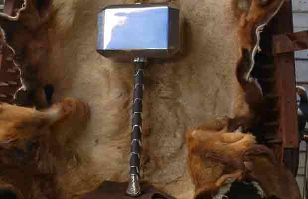 Cette version du Mjöllnir est légèrement plus grande que le marteau original utilisé dans les films Marvel. Il a été fabriqué à partir de feuilles d’acier chromées et pèse environ 9 kilogrammes (malgré le fait qu’il soit creux).