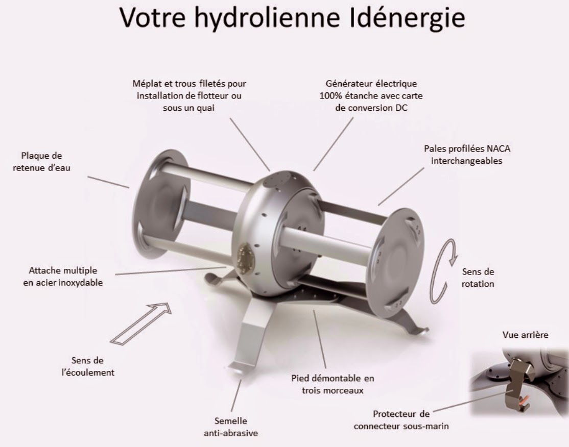 L’entreprise Québécoise IDENERGIE développe depuis quelques années une Hydrolienne portative, un appareil ingénieux qui transforme les cours d’eau en source d’électricité. Contrairement au vent et à moins d’une sécheresse, la rivière permet sans trop de difficulté, d’alimenter en électricité et en continue les besoins d’une petite maison ou d’un camping car pour l’éclairage, la recharge de batteries, le frigo et un accès à internet… Encore faut-il habiter près rivière me direz-vous.
