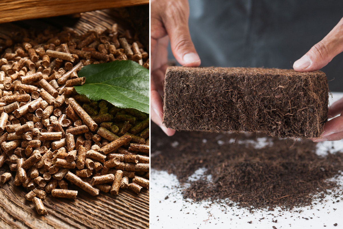 Des granulés de pellets en tourbe de noix de coco.