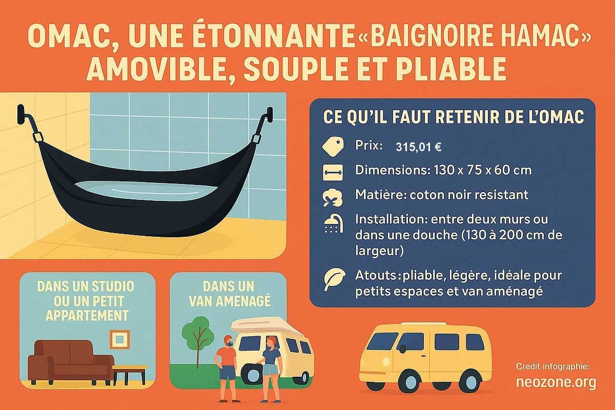 Infographie : découvrez la baignoire hamac Omac, souple, pliable et idéale pour les petits espaces comme pour les vans aménagés. Crédit infographie : neozone.org
