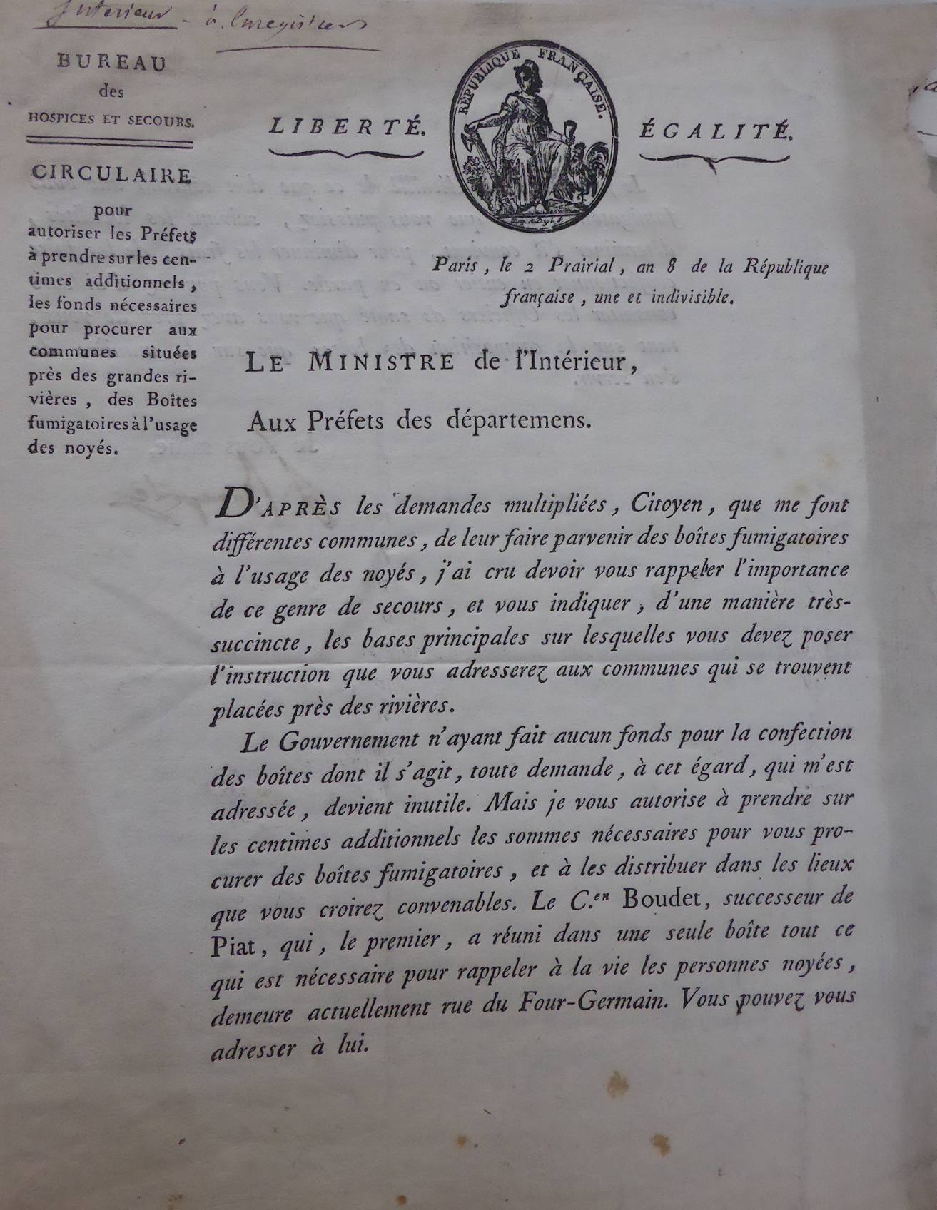 Une circulaire du ministre de l’Intérieur explique l’importance des boites fumigatoires pour venir au secours des noyés. Il joint également la description d’un contenu type d’une boite fumigatoire: