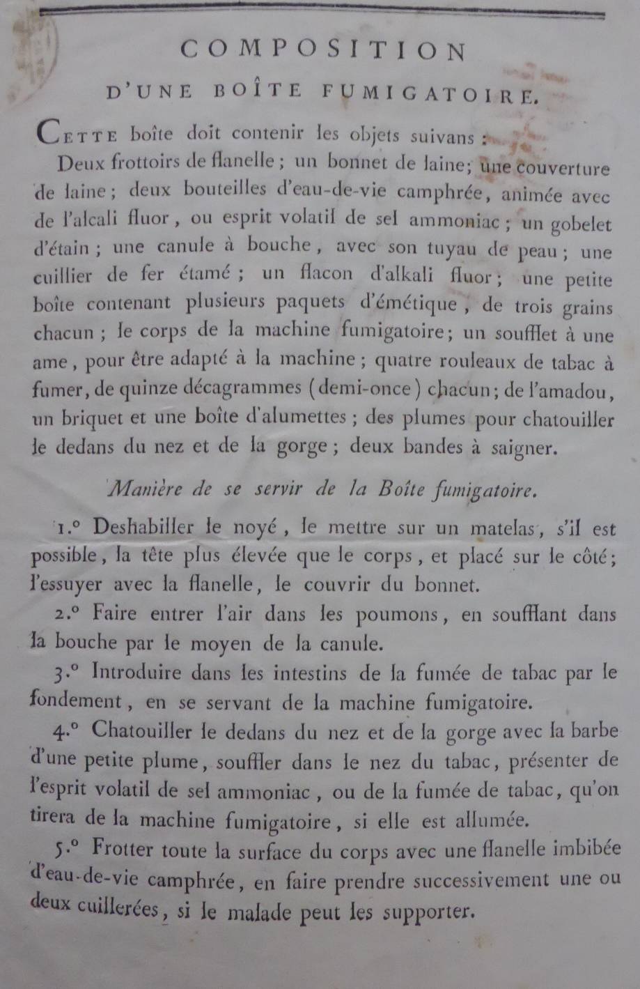 Le contenu d’une boite fumigatoire. CETTE boite doit contenir les objets suivants : deux frottoirs de flanelle ; un bonnet de laine ; une couverture de laine ; deux bouteilles d’eau-de-vie camphrée, animée avec de l’alcali fluor, ou esprit volatil de sel ammoniac ; un gobelet d’étain ; une canule à bouche, avec son tuyau de peau ; une petite cuiller de fer étamé ; un flacon d’alcali fluor ; une boite contenant plusieurs paquets d’émétique, de trois grains chacun ; le corps de la machine fumigatoire ; un soufflet à une âme, pour être adapté à la machine ; quatre rouleaux de tabac à fumer, de quinze décagrammes (demi-once) chacun ; de l’amadou, un briquet et une boite d’allumettes ; des plumes pour chatouiller le dedans du nez et de la gorge ; deux bandes à saigner.