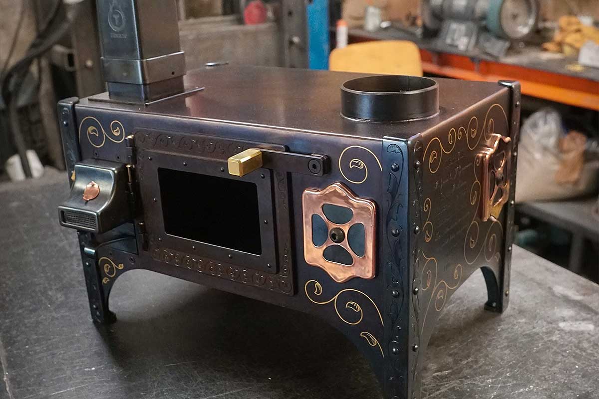 Pour leur 100ᵉ poêle, ils ont fait graver et poser des inserts en laiton, pour un objet unique et très stylé. Crédit photo : Tibrazié