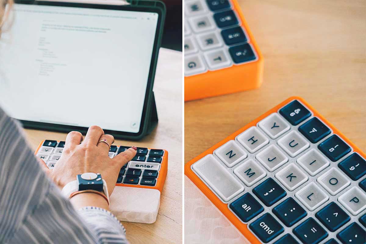 OnCue n’est pas un clavier classique. C’est un dispositif modulaire, ergonomique et intelligent conçu pour réduire les erreurs de frappe. Grâce à une disposition ortholinéaire et des touches surélevées, l’utilisateur adopte une posture plus naturelle, limitant la fatigue des mains et des poignets. Mais le vrai coup de génie se trouve dans les signaux haptiques et visuels. À chaque frappe, le clavier et les bracelets vibrent légèrement pour aider le cerveau à maintenir un rythme. Si la touche est maintenue trop longtemps, la vibration augmente, rappelant à l’utilisateur qu’il doit relâcher son geste.