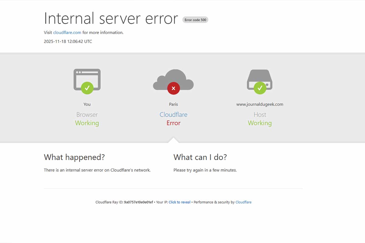 Aujourd’hui depuis quelques minutes, le service de DNS Cloudflare est victime d’une panne massive depuis ce matin, touchant de nombreux sites internet et services en ligne ChatGPT, le Journal du Geek, X (anciennement Twitter), Presse Citron, et même NeozOne par le biais des commentaires (le robot antispam est hors service). Les internautes rencontrent une page d’erreur « Internal server error » bloquant intégralement l’affichage des pages internet. La cause de cette panne mondiale est toujours inconnue à l’heure où j’écris ces lignes.