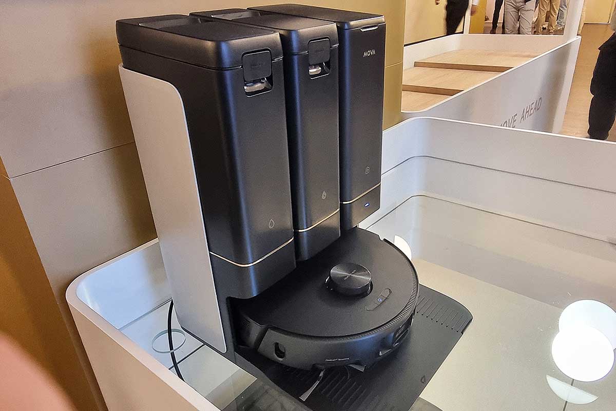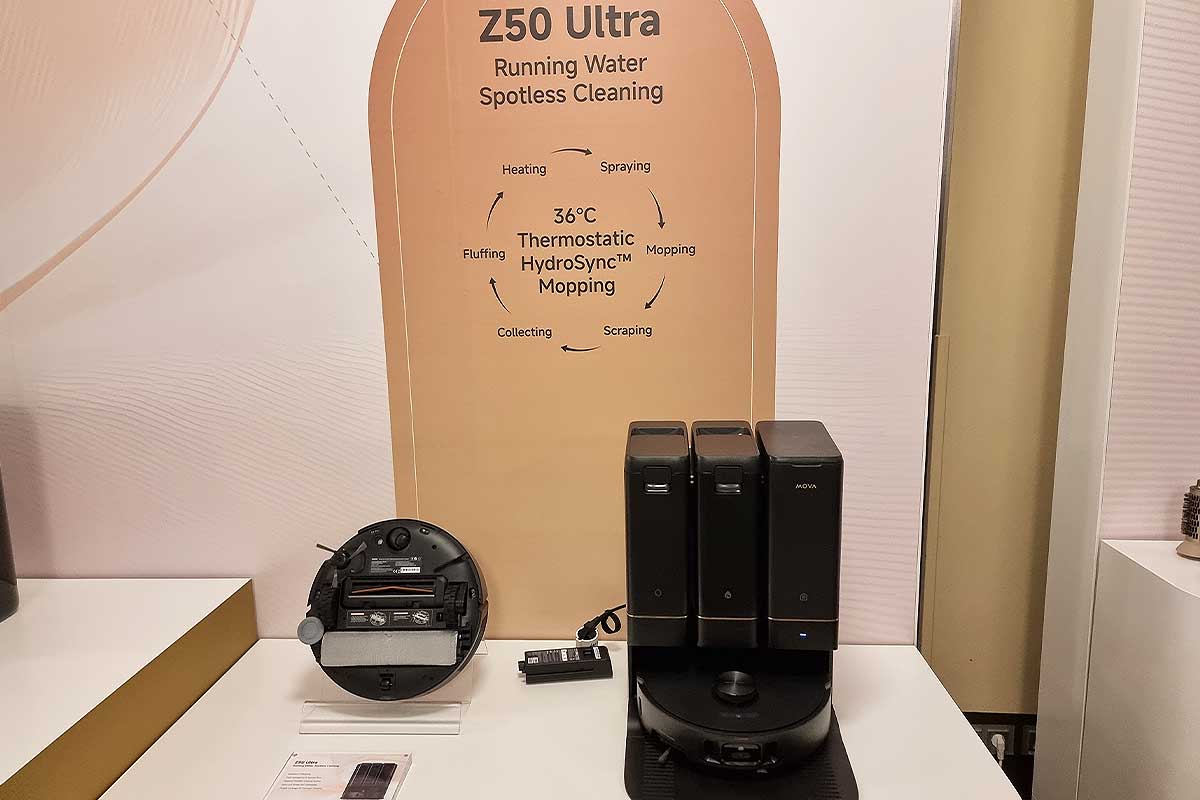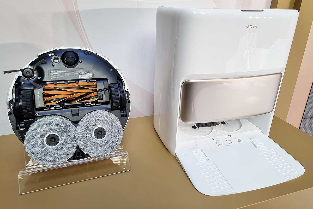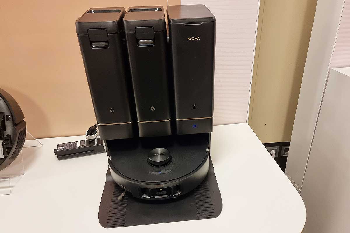 Dans l’euphorie berlinoise, on aurait presque oublié que le MOVA Z50 Ultra existe lui aussi. Et, qu’il n’a pas à rougir face à son grand frère. Proposé à 1 199 €, le Z50 Ultra brille par sa puissance d’aspiration de 19 000 Pa, un lavage à l’eau chaude à 36 °C, et une autonomie de 155 minutes. Ce modèle se démarque par son système de brosses haute efficacité et sa serpillière déportée, idéale pour nettoyer efficacement les bords et les angles. Il adapte aussi sa puissance d’aspiration sur les tapis, et propose une cartographie 3D extrêmement précise grâce à une technologie caméra + laser. Il possède un réservoir d’eau propre de 4,5 L, un sac à poussière de 4 L et une station de charge autonome capable de vidanger, remplir, nettoyer et sécher automatiquement.