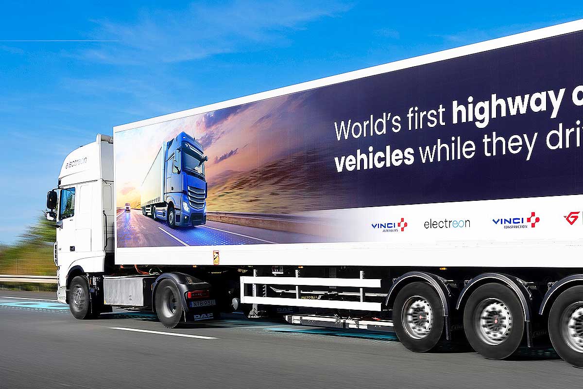Un camion électrique circulant sur une portion d'autoroute à induction.