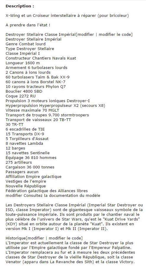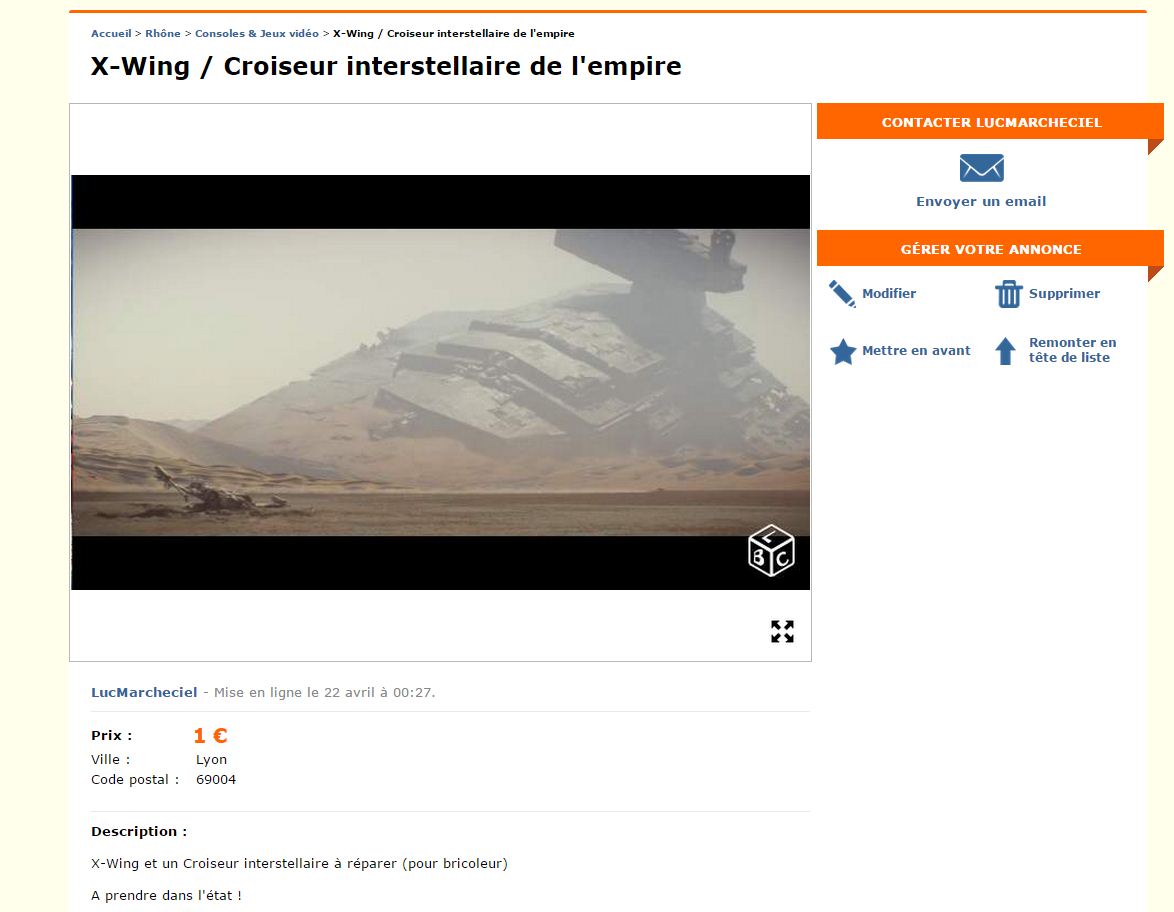 Si vous êtes un peu bricoleur et fan de Star Wars j’ai peut être une bonne affaire pour vous. Un X-Wing, symbole de la rébellion et un imposant Croiseur interstellaire de l’empire sont à vendre sur Leboncoin.