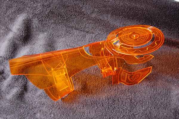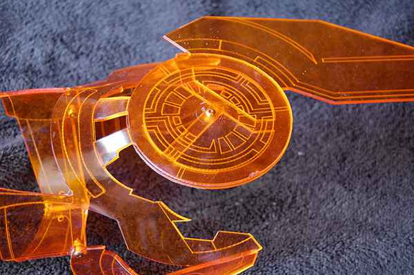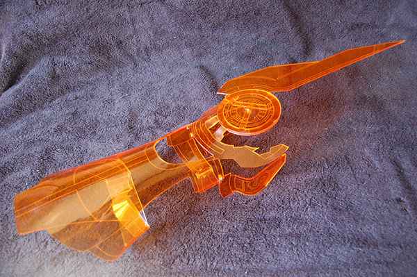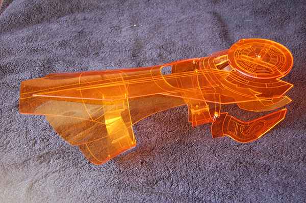 Pour arriver à ce magnifique résultat, Chris Myles a utilisé une feuille d’acrylique de 2,5 mm d’épaisseur. Chaque pièce a été découpée au laser, chauffée et ensuite pliée à la main, ce qui en fait l’accessoire idéal pour le copslay du Commandant Shepard que je vous avais présenté il y a quelques semaines.