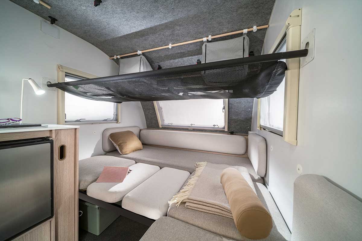 Une caravane qui dispose de 3 couchages, dont un lit hamac. Crédit photo : Adria
