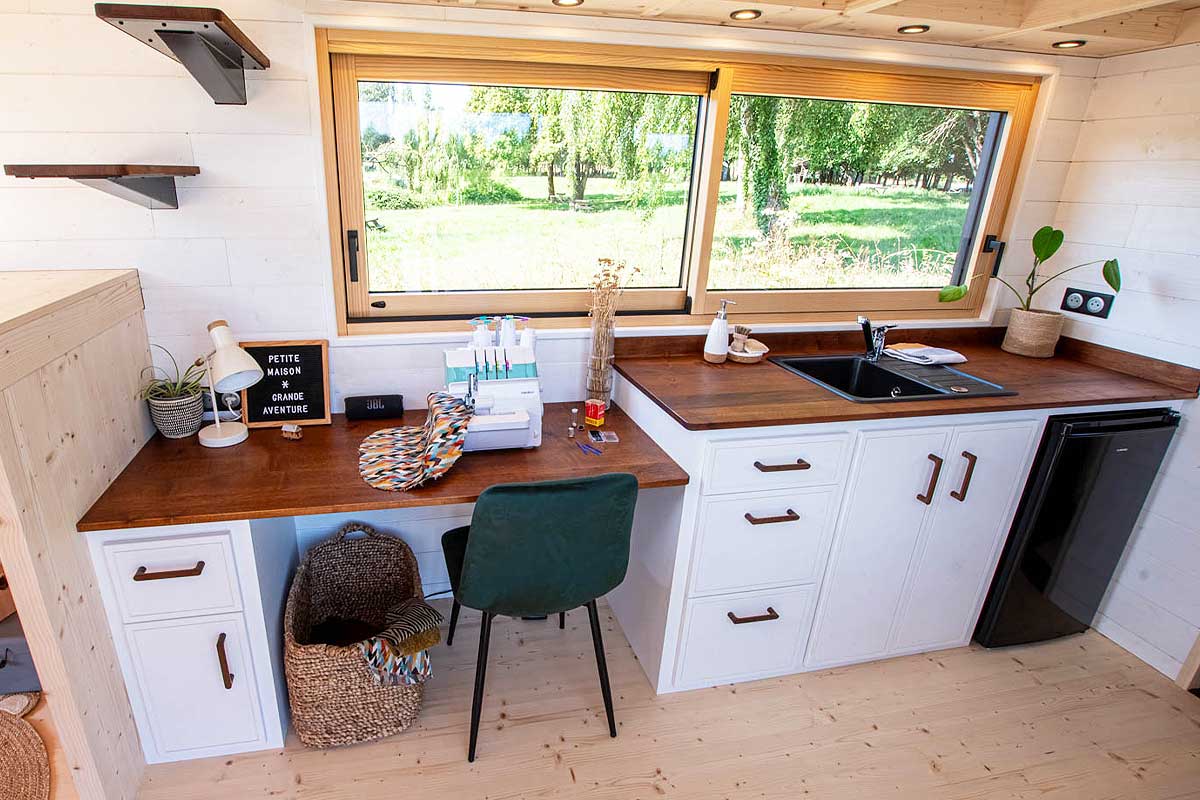 Dès l’entrée, l’atmosphère respire la clarté et la chaleur grâce au bois clair qui habille murs et plafonds. La cuisine occupe une partie de la longueur, avec son évier, ses rangements, son four et sa plaque de cuisson encastrés, le tout sublimé par un plan de travail en noyer massif. On y retrouve aussi un petit bureau intégré, indispensable pour Nadège et ses travaux de couture. L’ensemble dégage une impression de fluidité et d’efficacité : chaque mètre carré est optimisé sans sacrifier le confort.