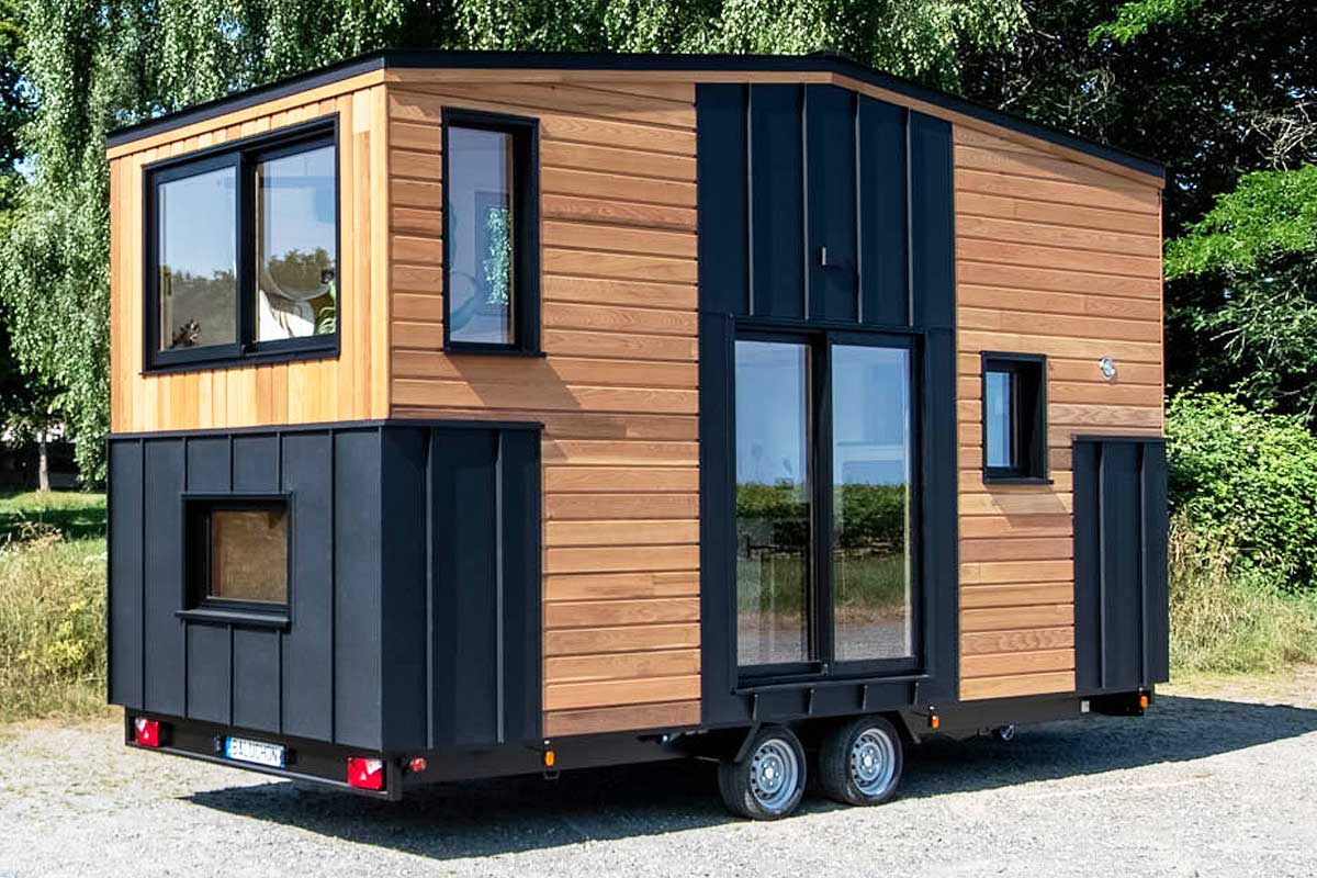 De l’extérieur, la tiny house Nouvelle Danse joue sur les contrastes. Le bois naturel clair des façades s’harmonise parfaitement avec des panneaux sombres, donnant un style moderne et chaleureux à la fois. Posée sur une remorque double essieu, elle conserve sa mobilité, mais s’affirme visuellement comme une véritable maison contemporaine miniature. Les grandes baies vitrées ne sont pas seulement esthétiques : elles transforment l’intérieur en un espace baigné de lumière naturelle, nécessaire lorsque l’on coud pendant de longues heures.