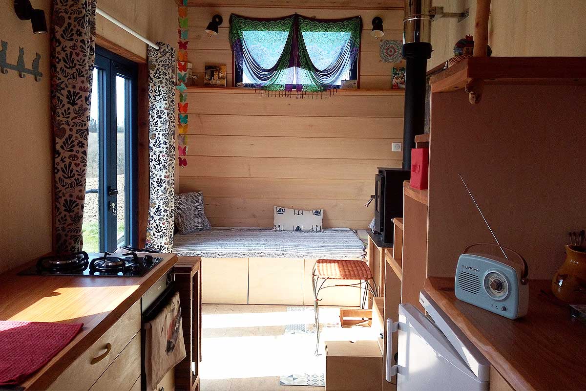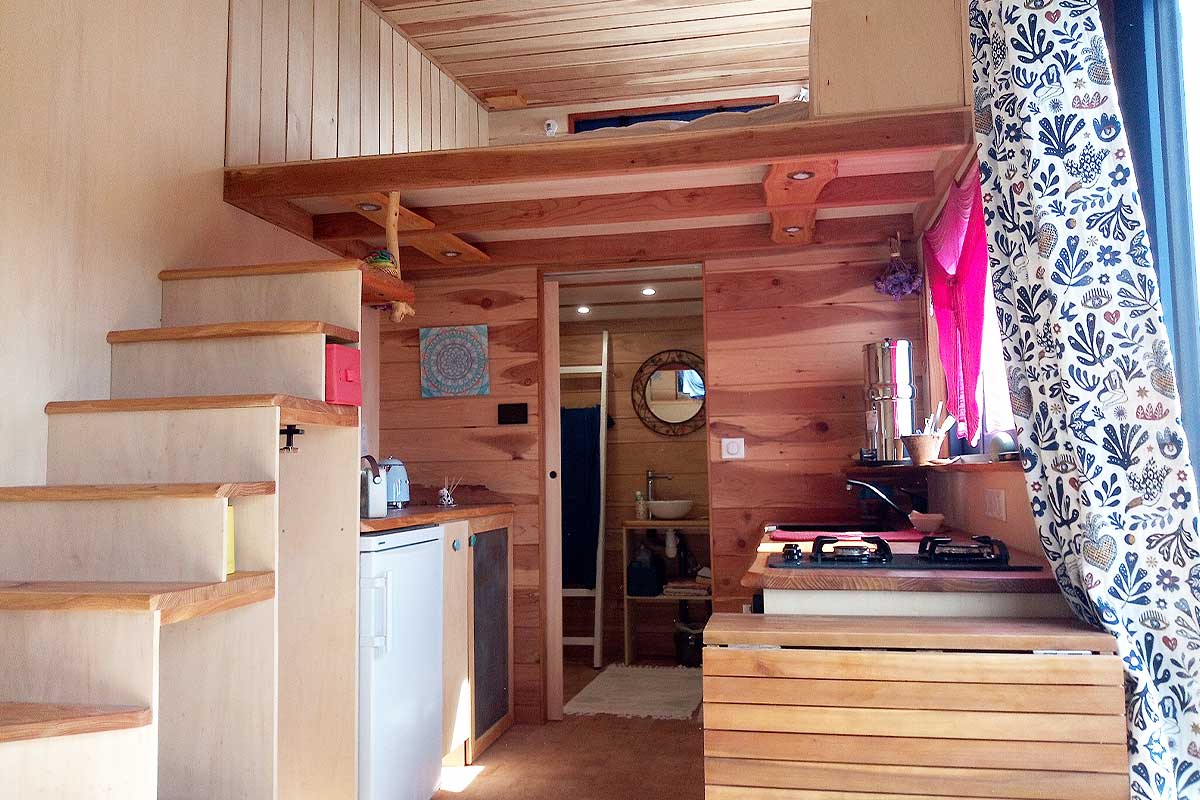 Ce qui rend l’Atelier Bois d’Ici si particulier, ce n’est pas seulement le charme de leurs tiny houses, mais leur façon de les fabriquer. Leur spécialité : travailler du bois local, scié sur place, sans traitement chimique agressif. Le résultat, ce sont des intérieurs chaleureux, durables et non toxiques. Leur modèle Tiny Birdy reflète parfaitement cet esprit : une maison compacte de 6 mètres, un loft lumineux, un poêle à bois, une cuisine pleine de rangements et un style bohème assumé. On est loin des tiny houses futuristes façon catalogue, ici tout respire le naturel et l’artisanat.