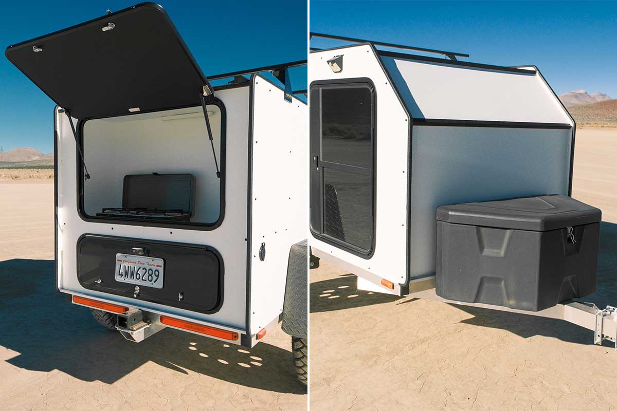 Là où Ecno Evil marque un vrai point, c’est dans l’intégration d’un espace de stockage accessible de l’extérieur. Une idée brillante : on peut y ranger le réchaud, l’eau, les chaises ou les casseroles sans risquer de tout entasser près du matelas. La caisse monobloc repose sur un châssis en aluminium destiné à éviter la corrosion, tandis que la suspension Timbren sans essieu absorbe les irrégularités du terrain. La version de base est déjà bien équipée, mais on peut ajouter un panneau solaire 100 W, une power station ou des pneus tout-terrain. Avec ses 354 kg, elle peut être tractée par presque n’importe quel véhicule, même une citadine.