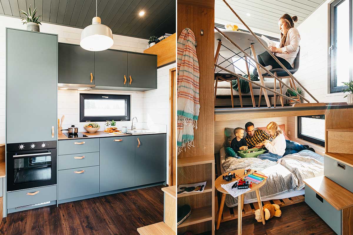 Une autre image, de l’intérieur cette fois, illustre parfaitement l’atout majeur de la Tiny Getaway : son côté pratique. En entrant, on trouve une cuisine étonnamment complète pour une maison sur roues : four, plaques à induction, évier, lave-vaisselle et rangements en pagaille. Ajoutez à cela un plan de travail convivial, parfait pour poser croissants et jus d’orange au petit déjeuner. Et puis, détail qui change tout : le salon est installé à l’étage, accessible par un escalier intégrant des rangements. On y retrouve un canapé, une petite table et quelques assises supplémentaires. Juste en dessous, une chambre secondaire avec lit double profite de cet aménagement malin, malgré un plafond un peu bas. De quoi proposer un espace intime aux invités ou aux enfants.