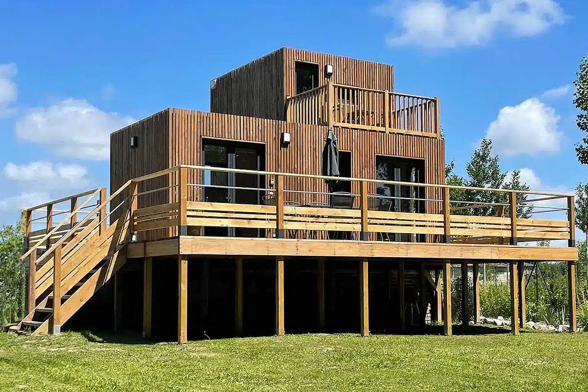 Et, si le rêve d’une maison en bois contemporaine, respectueuse de la nature et abordable devenait enfin réalité ? C’est le pari relevé par Greenkub, constructeur français spécialisé dans les habitats compacts en ossature bois. Nous avions déjà parlé de l’entreprise, par le biais du studio de jardin ou encore de leurs extensions pour agrandir votre maison… Cette fois, c’est la dernière réalisation de l’entreprise française que je souhaite vous présenter. Elle, c’est une maison sur pilotis de 40 m², installée dans l’Hérault, ne dépassant pas les 100 000 €. Conçue pour la location saisonnière, elle a été imaginée pour Thomas et Claire, deux propriétaires souhaitant valoriser leur terrain situé en zone Natura 2000. Élégante, écologique et parfaitement intégrée dans le paysage, cette maison a été pensée pour réduire au maximum son empreinte environnementale. Le chantier a été mené avec précision : préfabrication en atelier, fondations adaptées au sol méditerranéen et isolation performante. Le tout, bien sûr, dans le respect des exigences de la réglementation environnementale RE 2020. Petite visite guidée, et vous pourrez même la louer pour quelques jours. C’est parti.