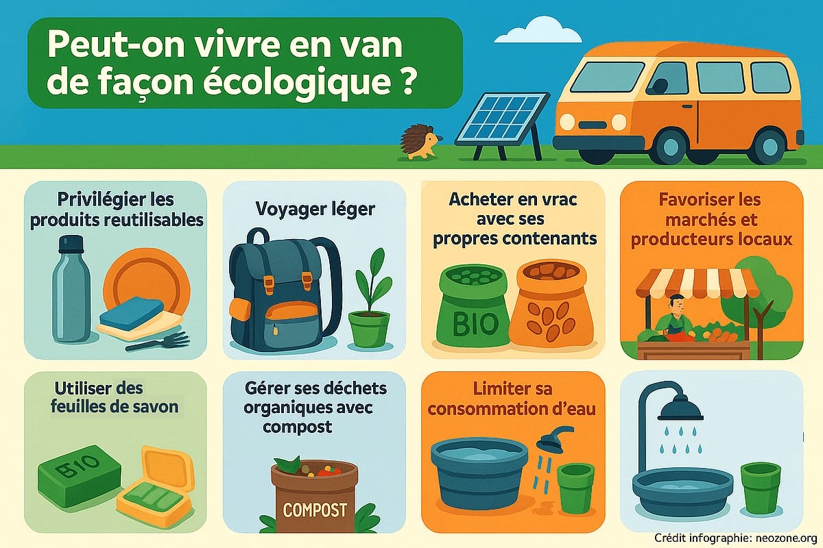 Infographie : astuces simples et efficaces pour rendre la vie en van plus écologique au quotidien, entre consommation responsable, gestion des déchets et économie d’eau. Crédit infographie : neozone.org