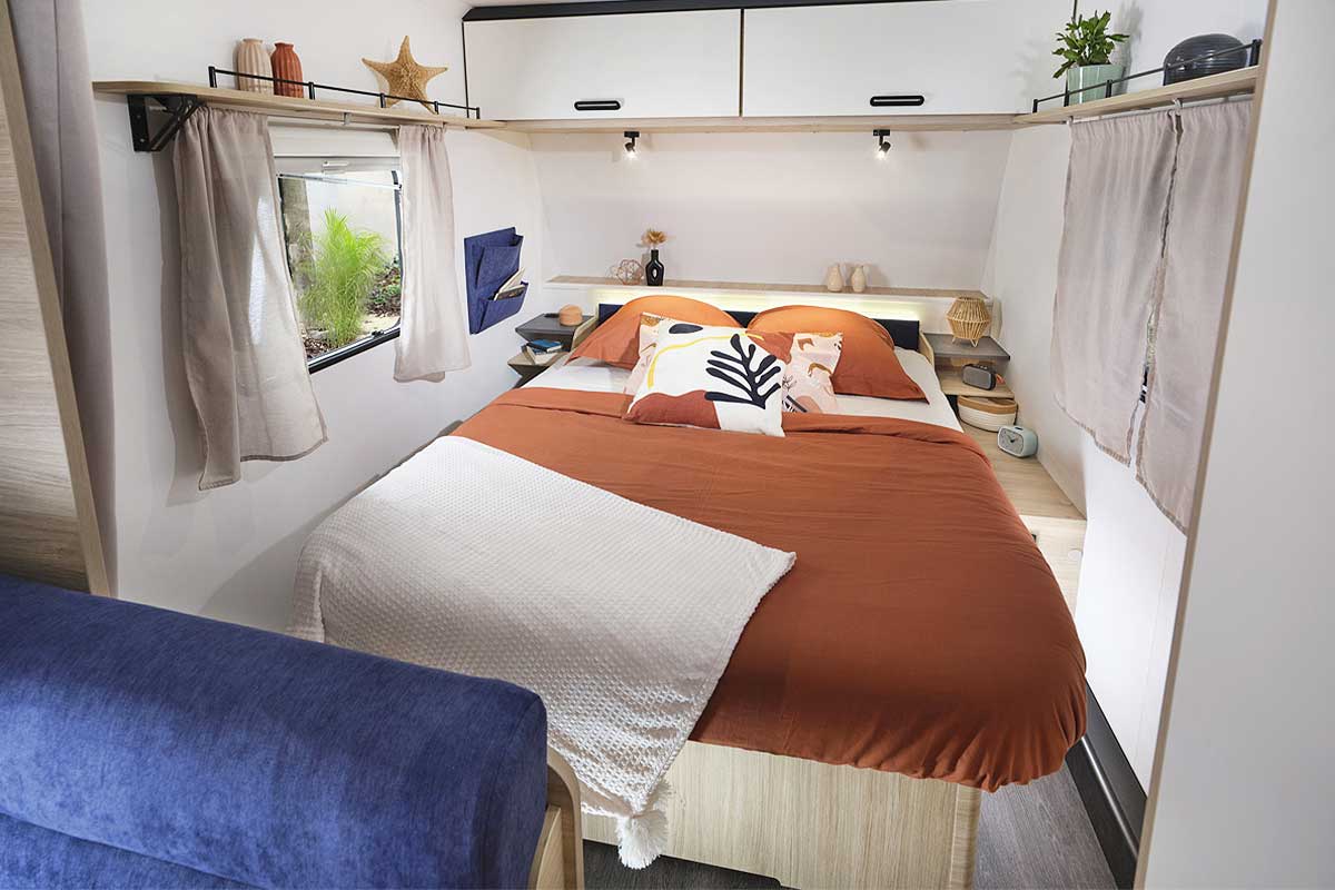 Adieu la caravane d’antan, ni jolie ni pratique : ici, place au bois clair, au design scandinave et à la lumière naturelle. En regardant le plan de la Easy 350CP, on découvre un aménagement optimisé :