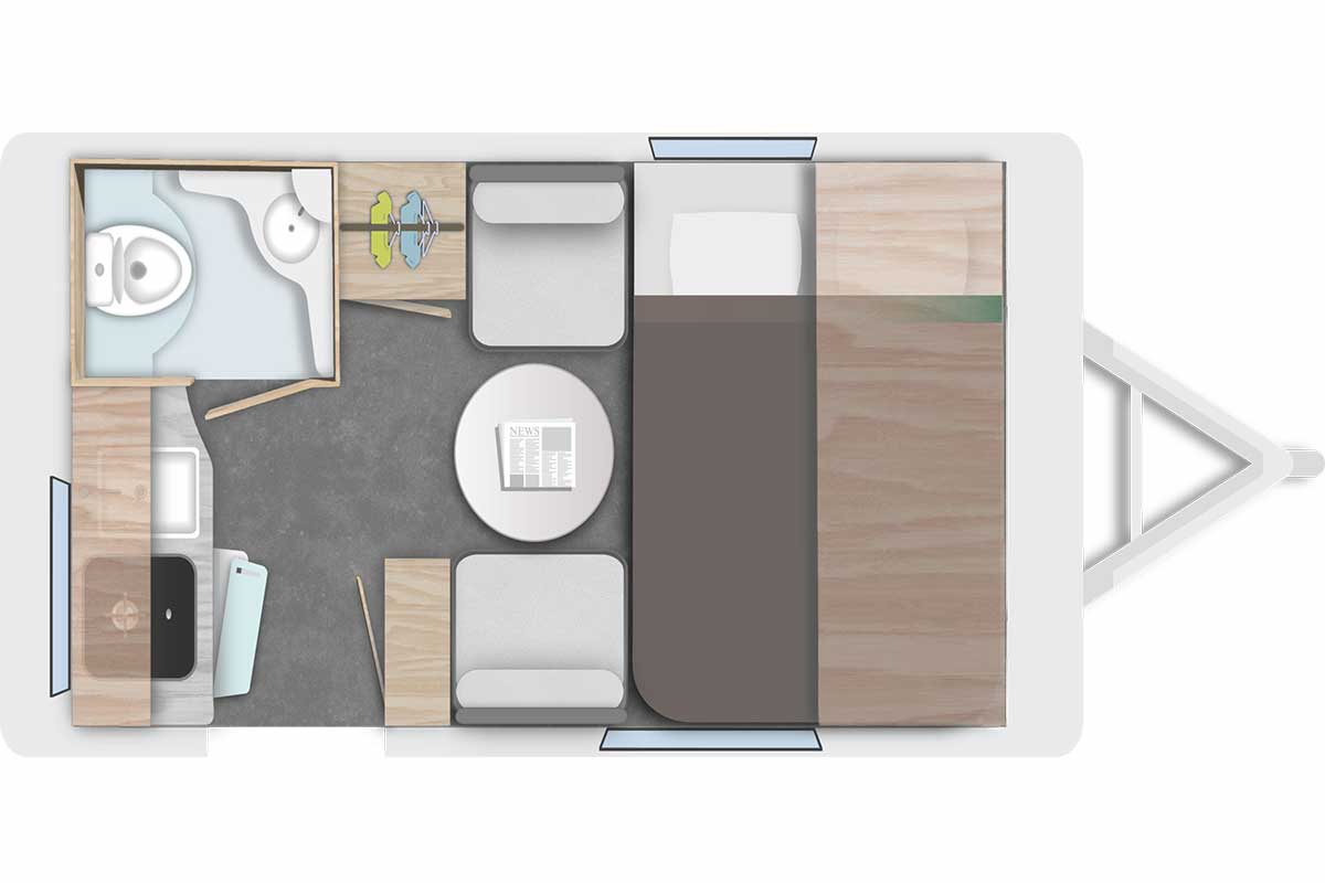 En Europe, le marché des caravanes a progressé de plus de 7 % ces dernières années. Un signe que la mobilité douce et l’esprit « slow travel » séduisent de plus en plus. Mais, attention, tout n’est pas parfait ! Comme nous vous l’expliquions dans cet article, les mini-caravanes exigent parfois des compromis : espace de rangement réduit, autonomie limitée ou absence de douche fixe. Pour ma part, je trouve qu’elles offrent le parfait équilibre entre confort et liberté. Et, après avoir vu de près le plan de cette 350CP, je me dis que je pourrais tout à fait y passer un week-end avec mes chiens, afin de vérifier si tout ce petit monde rentre sans se marcher dessus.