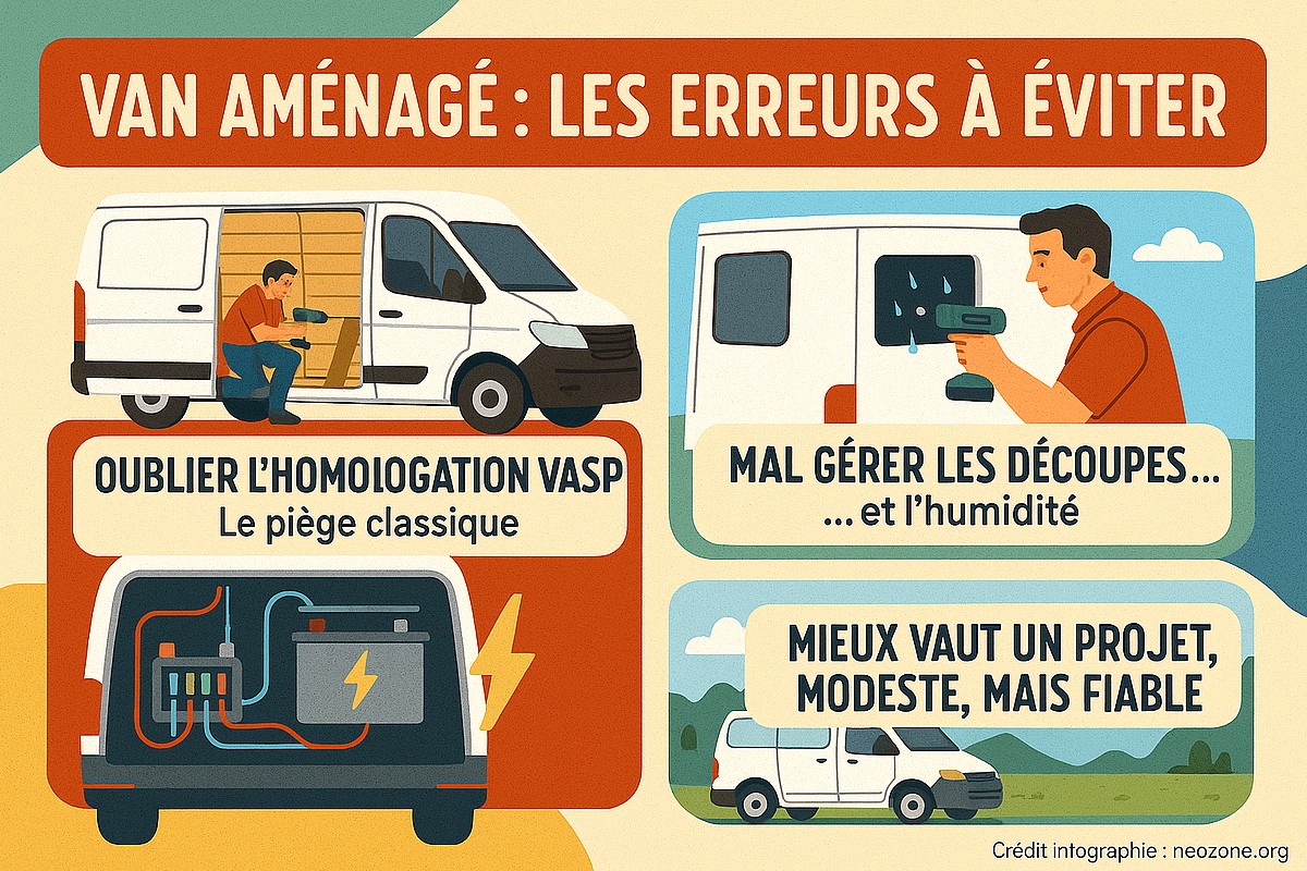 Infographie : erreurs courantes à éviter lorsqu’on aménage soi-même un van pour voyager sereinement et sans mauvaises surprises. Crédit infographie : neozone.org