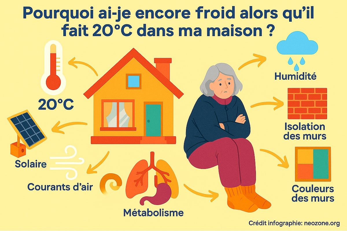 Depuis ma sleeve et la perte de 60 kilos (oui, oui, soixante !), j’ai l’impression d’être passée du mode sauna au mode congélateur. Même avec 23 °C au thermostat, je garde mon attirail de survie : gilet polaire, chaussettes pilou, pyjama doudou. Et, je ne parle même pas des réunions en mairie, dans des salles réglementairement chauffées à 19 °C : autant dire que sans mon châle fétiche, je me transforme en glaçon express. Mais, pourquoi donc a-t-on froid même quand la maison est chauffée “comme il faut” ? La réponse tient autant à la physique qu’à la biologie. Et, pour creuser la question, je me suis replongée dans notre précédent article sur NeozOne et dans les analyses de Météo France, Ouest France et FioulRéduc, qui ont exploré ce mystère du « froid intérieur ». Décryptage.