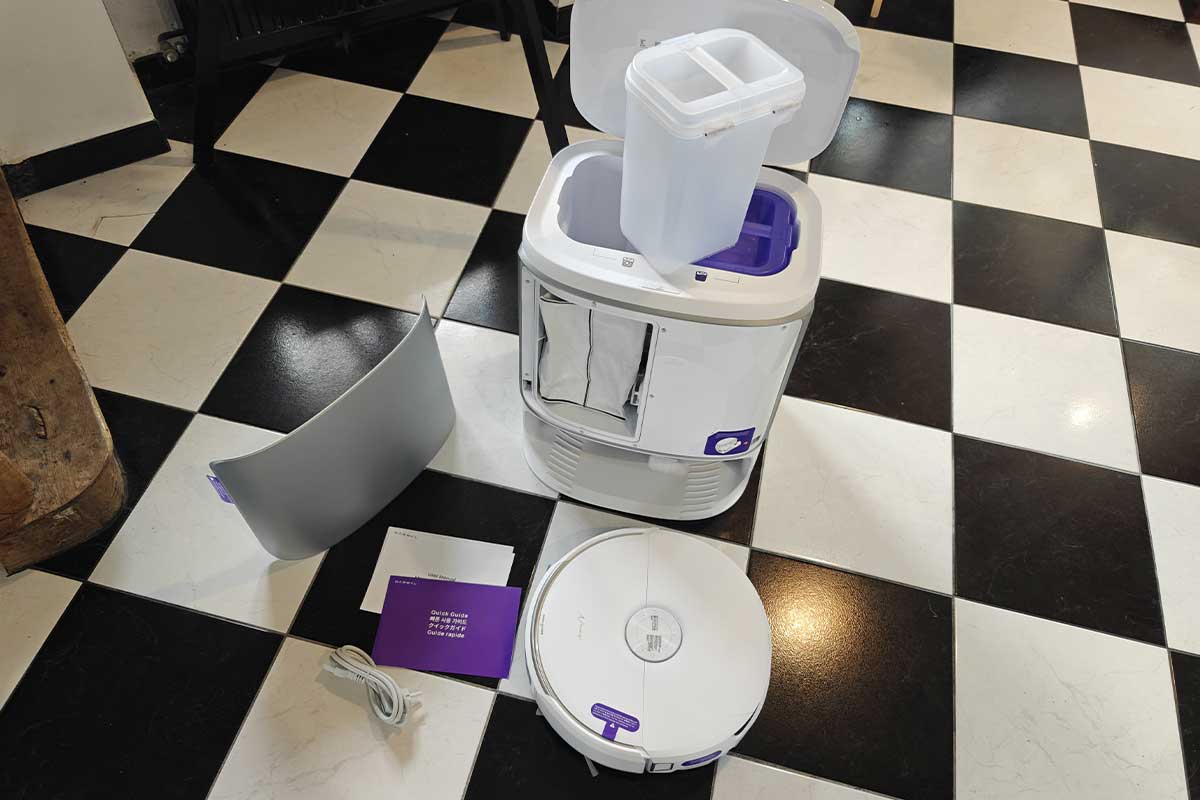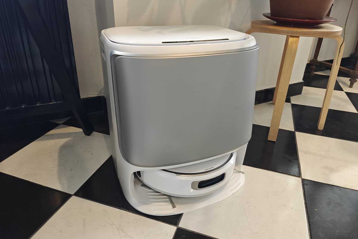 C’est probablement la partie la plus satisfaisante. Le Flow retourne automatiquement à sa base pour laver ses serpillières à l’eau chaude, vider la poussière, et se sécher à 45 °C. La base est un petit bijou d’ingénierie :