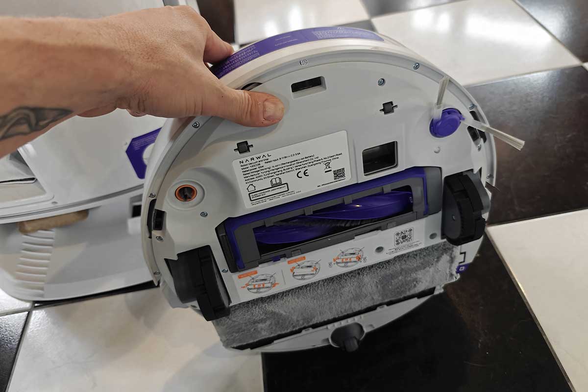 C’est LA promesse phare du Narwal Flow. Et, pour une fois, elle est tenue. Le système FlowWash nettoie la serpillière en continu grâce à 16 buses qui pulvérisent de l’eau fraîche, un rouleau qui applique une pression de 12 N, et un grattoir interne qui élimine les résidus. Résultat : à la différence d’autres robots qui passent plusieurs fois avec une serpillière de plus en plus sale, ici chaque passage est frais.