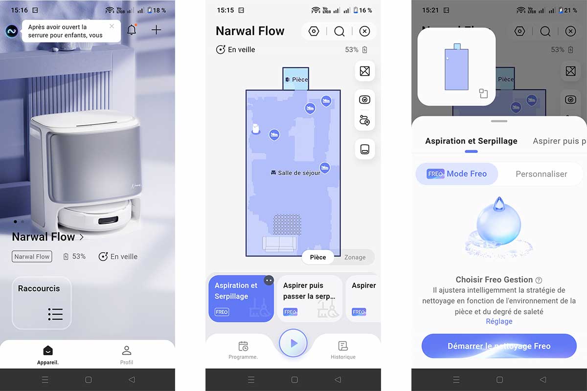 L’installation a été d’une simplicité enfantine : une fois la station posée (prévoyez quand même un peu d’espace), j’ai installé les deux réservoirs et rempli celui pour l’eau propre (le propre, c’est le violet, ne vous trompez pas). Le Flow s’est immédiatement connecté à mon Wi-Fi via l’application Narwal. Petit détail que j’ai apprécié : aucune donnée n’est envoyée dans le cloud. Le traitement d’images se fait localement, directement sur la puce IA du robot. Sécurité et respect de la vie privée : un bon point !