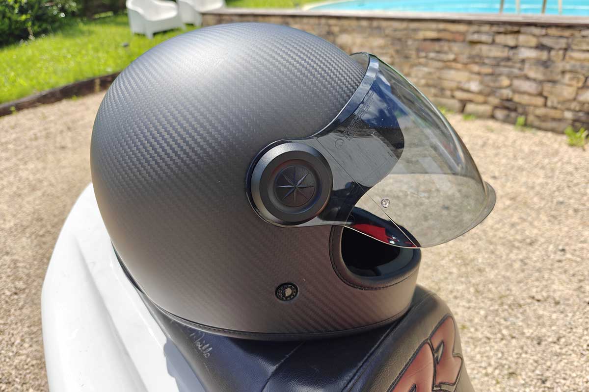 Il m’est assez difficile de décrire ce casque intégral néo-rétro tant il est unique. Je n’avais jamais observé un tel design auparavant avec son look unique et ses lignes épurées. Racé, presque agressif visuellement parlant, il ne passe pas inaperçu. Avec sa visière fumée et longue, il casse les codes des casques jets/intégraux et apporte un style différent au pilote qui le porte. Peu importe le style de votre moto, le casque Dark Side a été pensé pour tous les adeptes de l’engin. Que vous soyez amateurs de moto vintage, ou d’engins plus sportifs comme moi, il conviendra à votre mode de roulage. Bien entendu, un « beau casque » ne suffit pas, il se doit aussi d’être un parfait garant de votre sécurité. Ce sera évidemment le cas avec le Dark Side puisqu’il possède la nouvelle homologation ECE 22.06. De plus, vous investirez donc un modèle de casque disponible aussi en version « carbon » pour encore plus de légèreté.