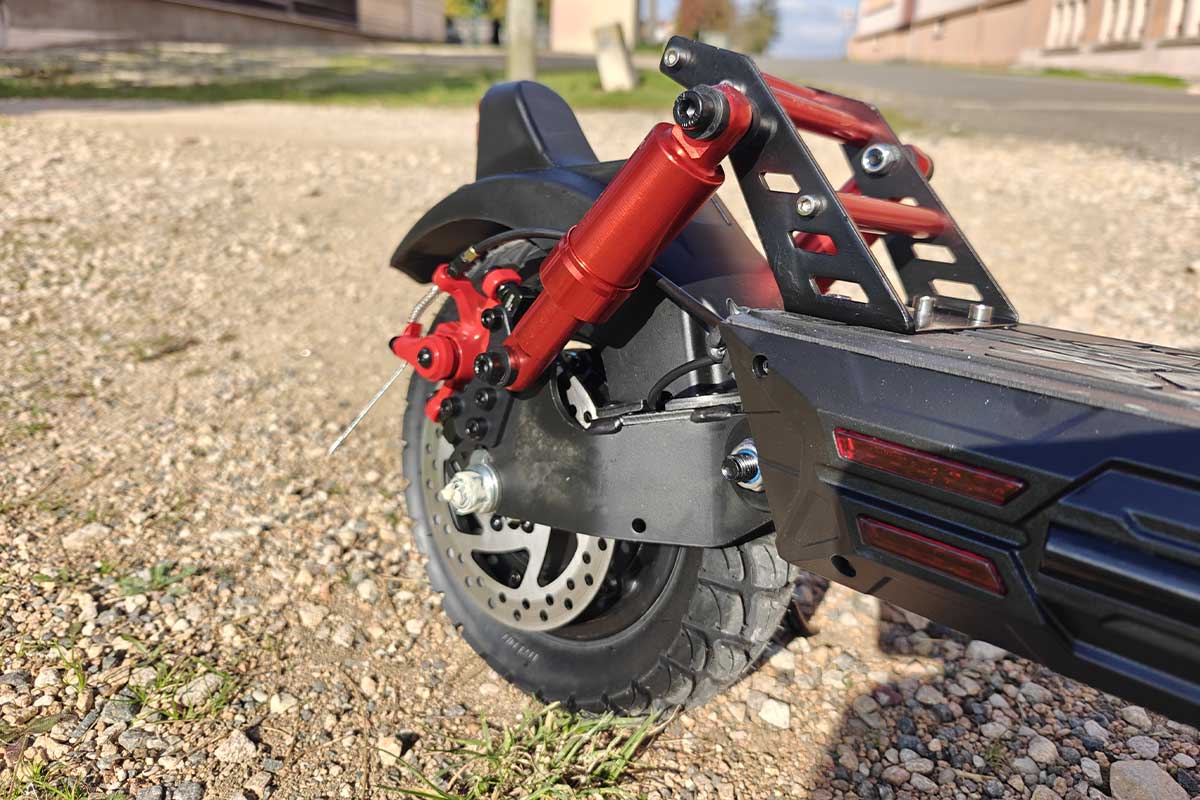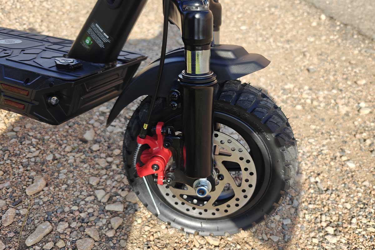 La GT1 propose un réel plaisir de conduite. Le plateau large assure une bonne stabilité, même à grande vitesse, et les pneus tout-terrain de 10 pouces adhèrent parfaitement. Le système de freinage combiné (disques avant/arrière + frein électronique caché) est réactif sans être brutal. Sur terrain humide, il reste progressif et fiable. Les suspensions à double ressort amortissent efficacement les chocs. Même sur les pavés ou les chemins de gravier, la trottinette ne vibre pas excessivement. On sent que la GT1 a été conçue pour durer.