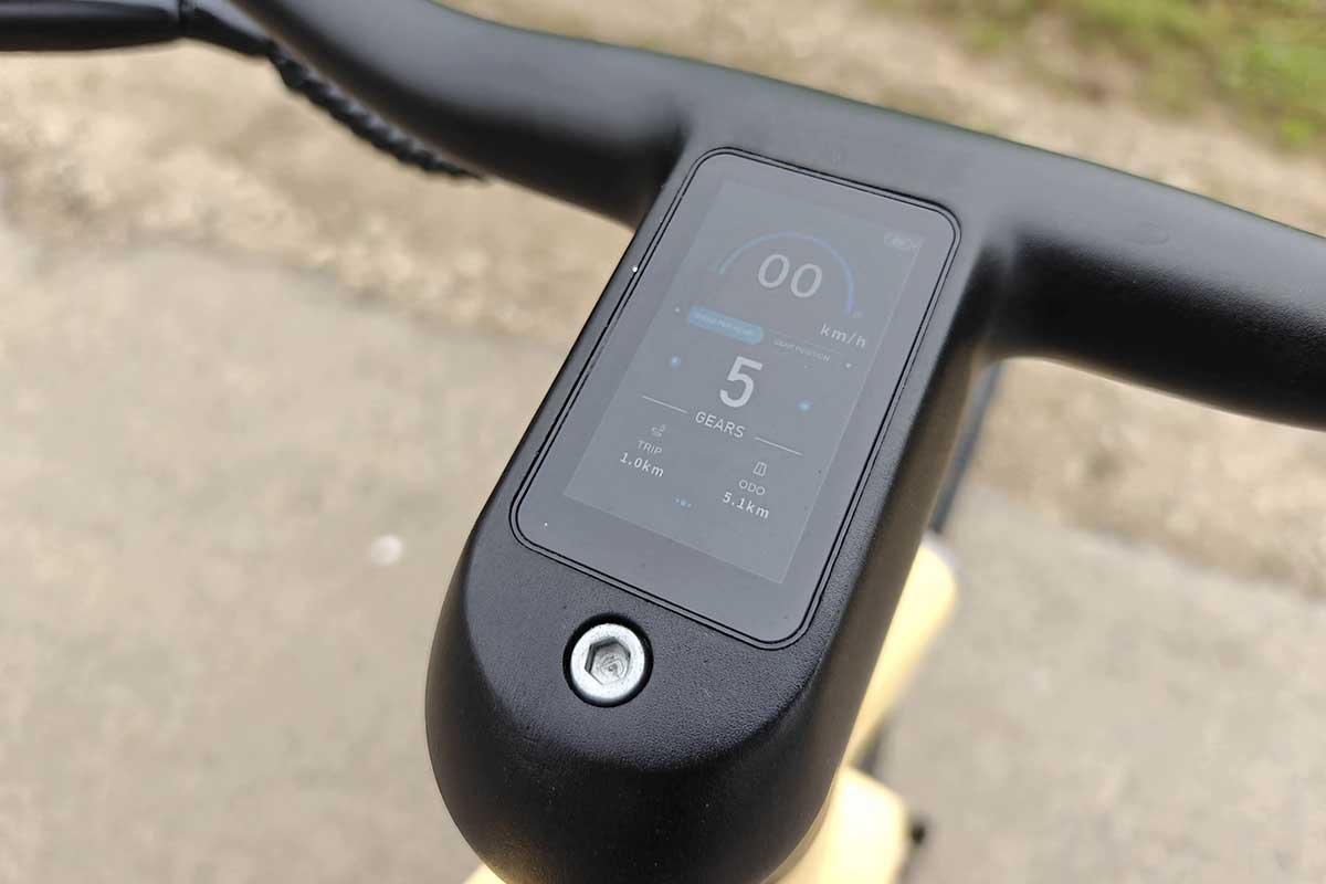 Bonne surprise : le montage est simplissime. Fixer la roue avant, installer les pédales et régler la hauteur de selle m’ont pris à peine dix minutes. La batterie amovible se clipse facilement, et la première recharge complète s’est faite en un peu plus de cinq heures. J’ai apprécié de pouvoir la retirer pour la charger à l’intérieur, plutôt que d’apporter tout le vélo jusqu’à une prise. Niveau électronique, l’écran TFT couleur intégré au guidon s’allume sans délai et propose une interface claire : vitesse, autonomie restante, niveau d’assistance, tout est là.
