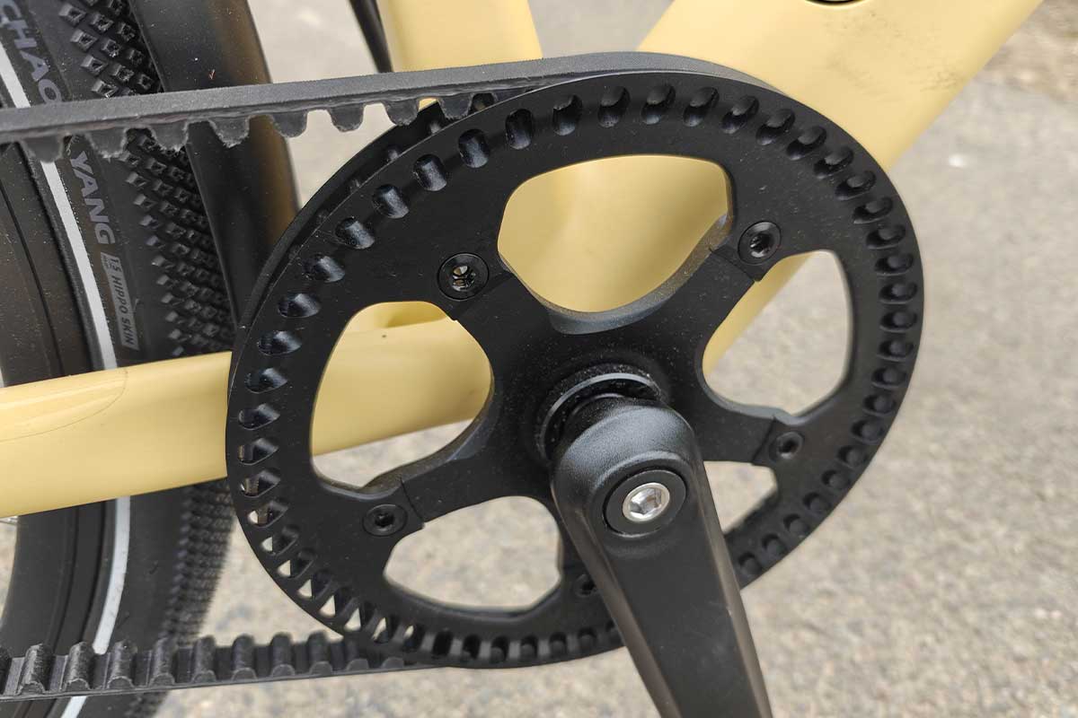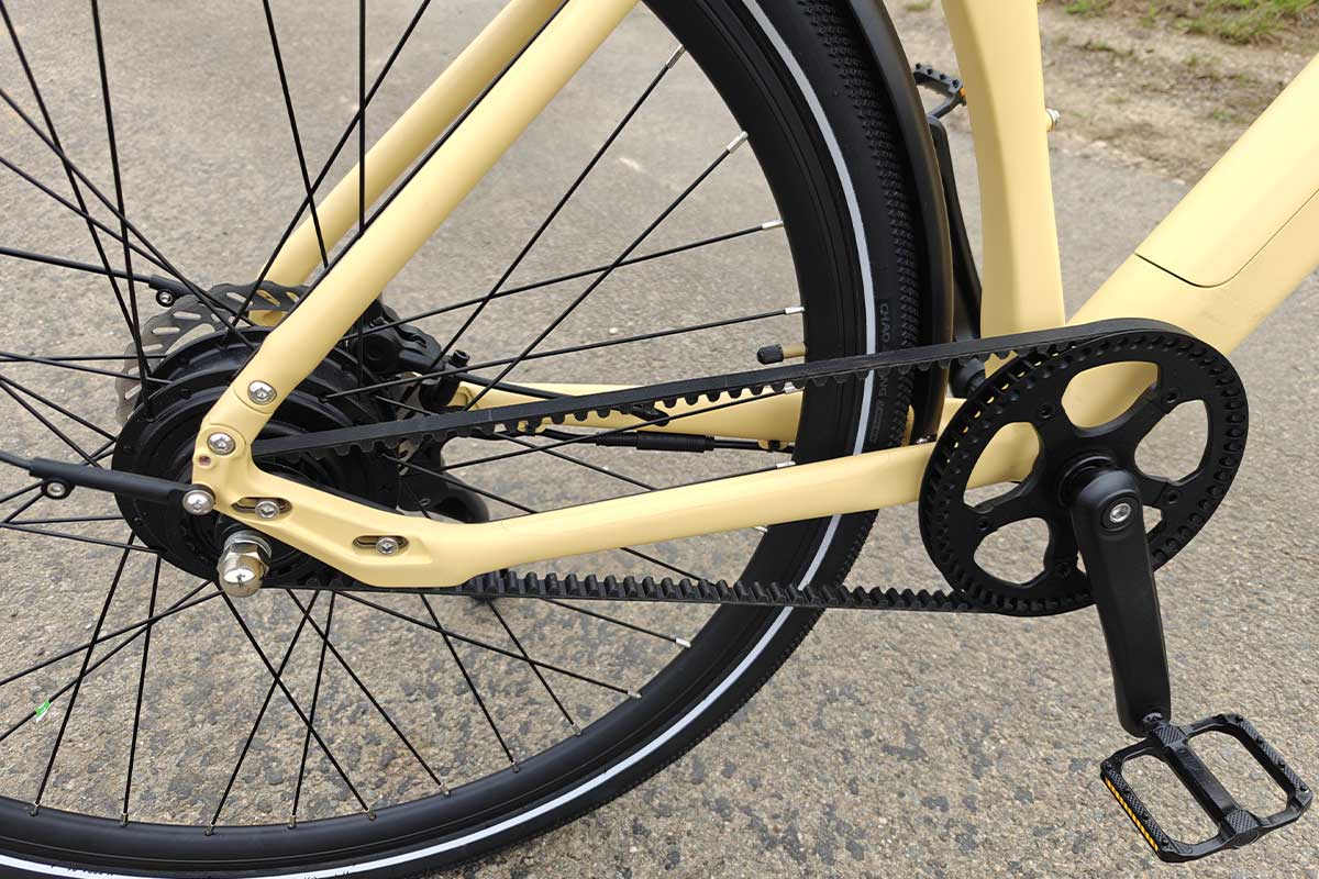 Adieu la chaîne traditionnelle et ses maillons graisseux ! L’AMANO S900 adopte une courroie carbone qui promet 30 000 km sans entretien. Concrètement, cela se traduit par un pédalage silencieux, fluide et sans secousse. Lors de mes sorties matinales, j’ai particulièrement apprécié de ne pas gêner le voisinage ou les piétons croisés, avec un cliquetis métallique. Et, mes pantalons blancs lui disent merci : aucune trace noire en vue. Même sous la pluie, la courroie ne s’est jamais mise à grincer ni à sauter, ce qui confirme son côté zéro maintenance. J’ai pu enchaîner plusieurs trajets domicile-travail d’affilée sans même penser à l’entretien, un vrai luxe.