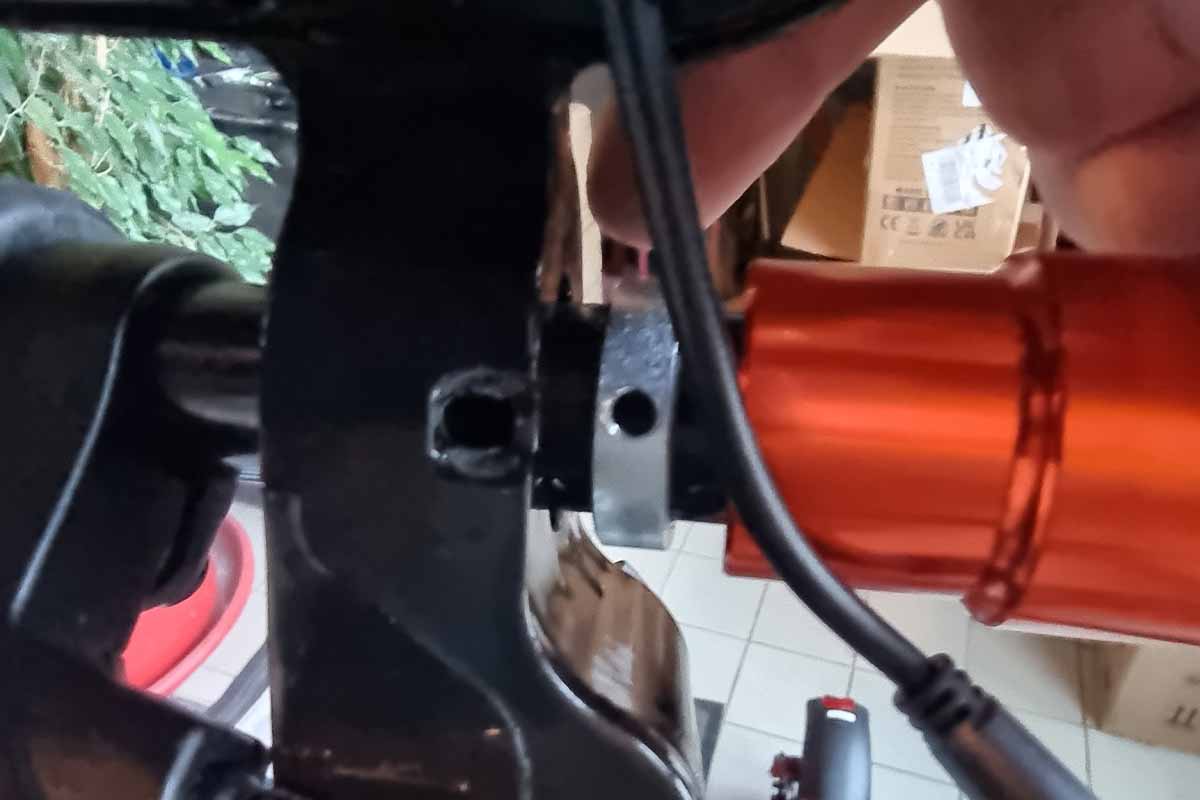 Les commodos et poignées de freins ne sont pas serrés, rien de très compliqué sauf… pour le système de fixation du panneau de contrôle (le même que celui de la Kugoo M4). En effet, la vis déjà positionnée n’est pas assez longue, il faut donc utiliser la vis supplémentaire fournie dans le kit d’outils. C’est indiqué nulle part, je vous laisse en conséquence imaginer le temps que cela nous a pris pour le comprendre… Pour cela, il faut aligner la rondelle (perforée) avec l’orifice de l’anneau de fixation (quelle galère).