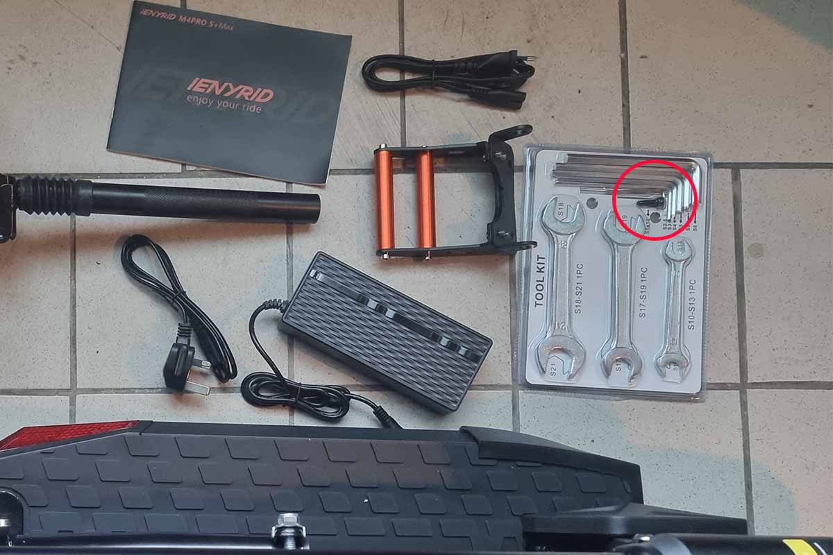 La trottinette est livrée dans un carton très imposant. Nous retrouvons à l’intérieur la trottinette, une selle, un repose-pied arrière, une notice et un cordon de rechargement US et EU ainsi qu’une pochette à outils.