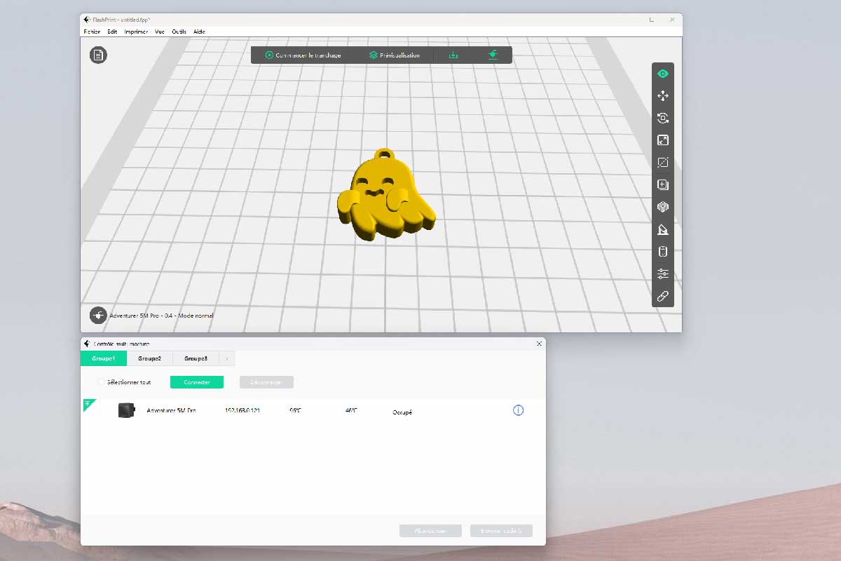 Pour l’appairage avec le logiciel (FlashPrint), il est pratiquement automatique. L’imprimante est reconnue en quelques seconde par le programme. On en profite donc pour lancer un fichier test d’impression (un cube) intégré dans la mémoire de la machine.