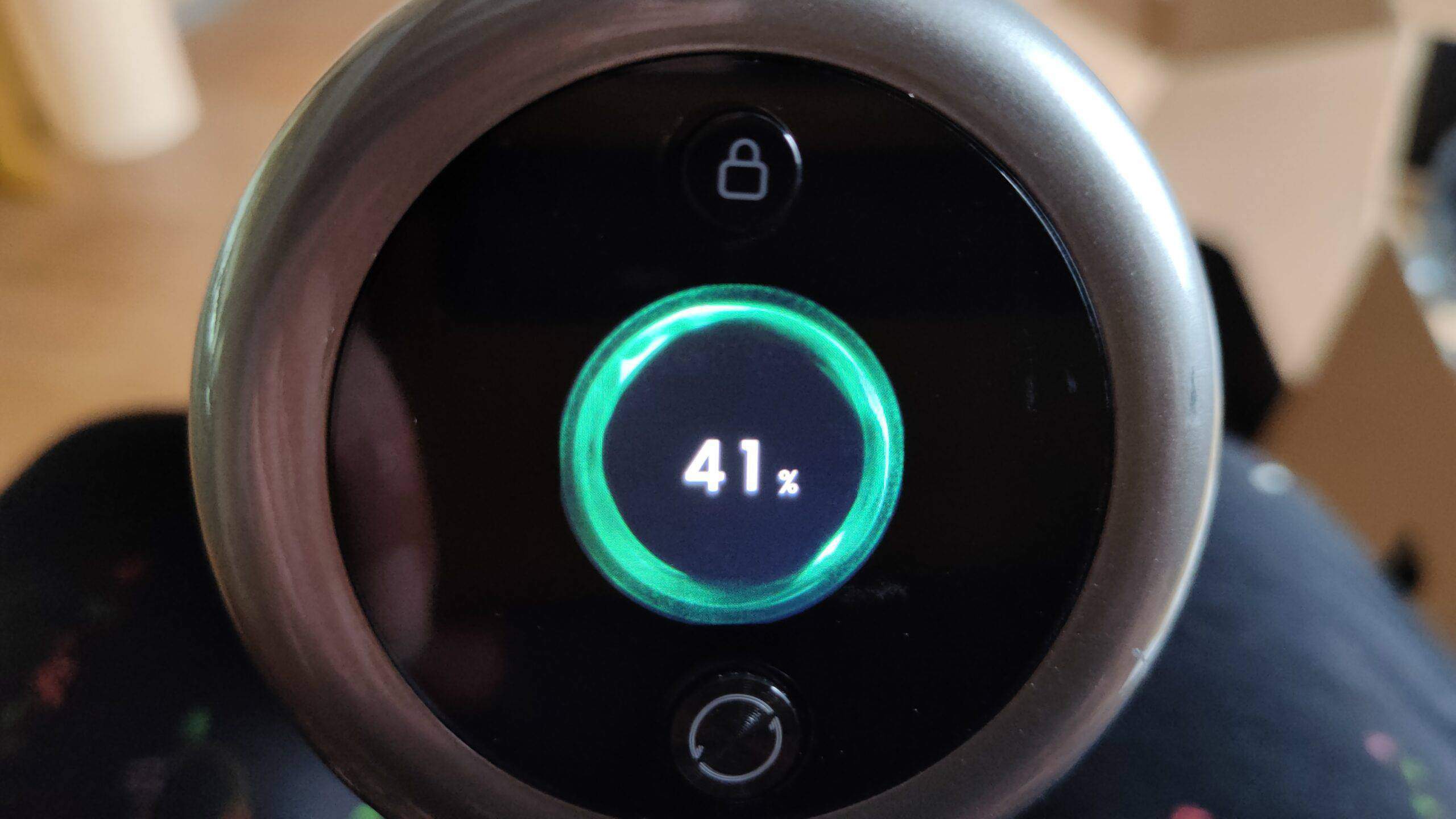 L’aspirateur dispose de trois modes de puissance, Eco, Med et Turbo. Selon l’utilisation que vous en ferez, l’autonomie de la batterie se videra plus ou moins vite mais il est possible de suivre en temps réel l’état de cette dernière. A l’instar de ses concurrents testés précédemment, il dispose également d’un système de filtration à cinq volets qui retient 99% des particules fines. L’aspirateur est léger, maniable et tous les accessoires se rangent sur le socle mural de rechargement. Petite précision, Dreame V12 Pro ne peut pas fonctionner pas pendant le rechargement.