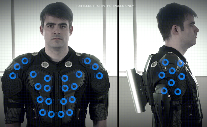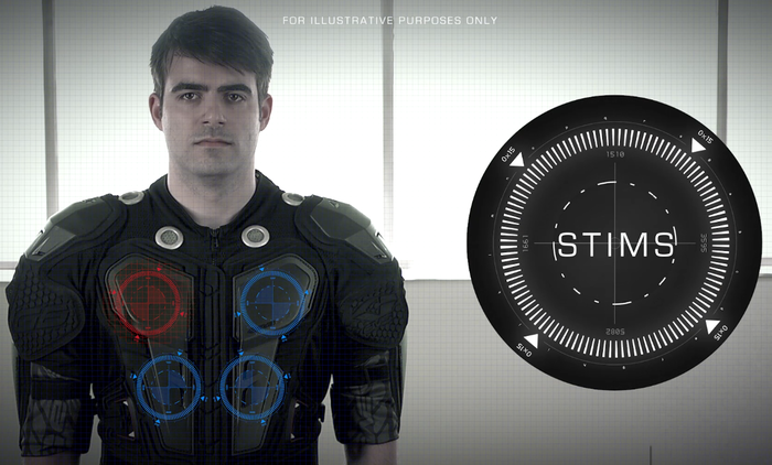 Dans cet objectif, La combinaison Araig est équipée de 48 points de vibrations, 16 moteurs de retour de force sur le torse, 16 autres dans le dos, et 8 au niveau des flancs et des bras. L’idée est de simuler par vibration les impacts de balles dans des zones très spécifiques. Pour les explosions et les chocs puissants, quatre larges pads baptisés STIMS sont positionnés au niveau du torse. Ils contracteront vos muscles pour encore plus de réalisme.