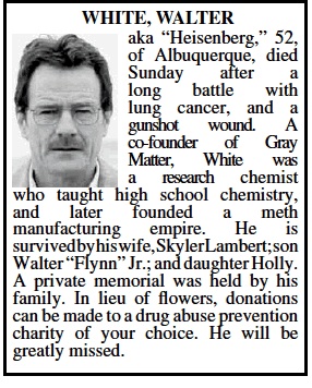 Dans un autre style, l’avis de décès (fictif) de Walter White dans la rubrique nécrologique d’un journal de la ville d’Albuquerque.