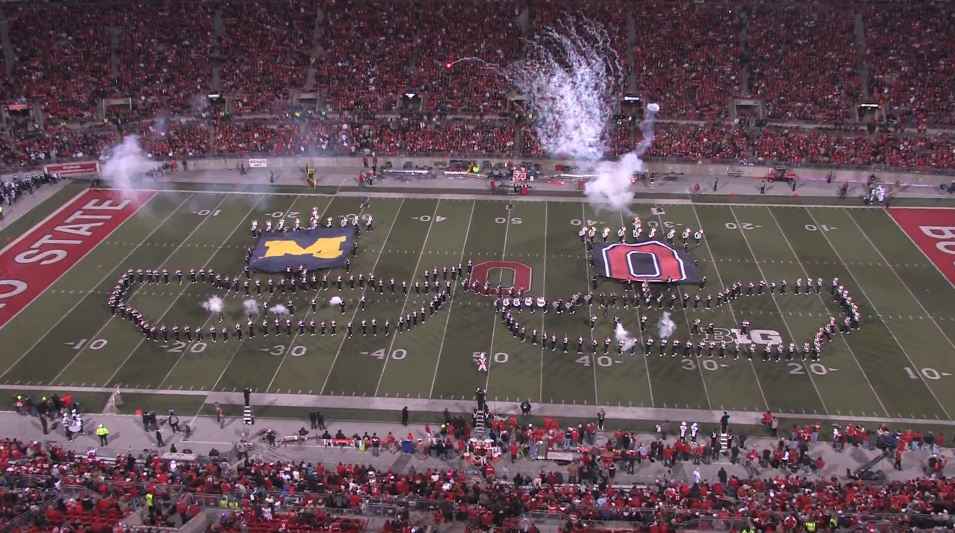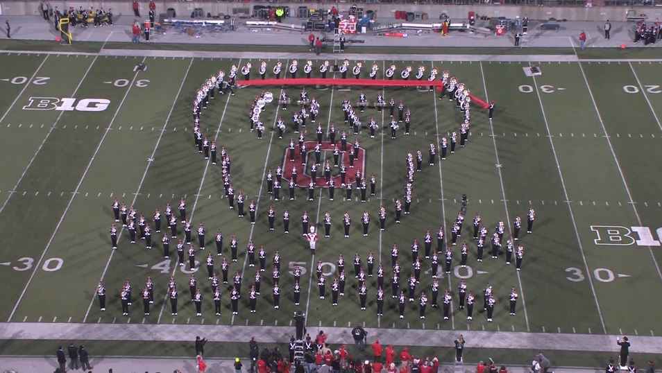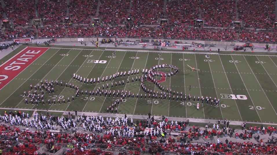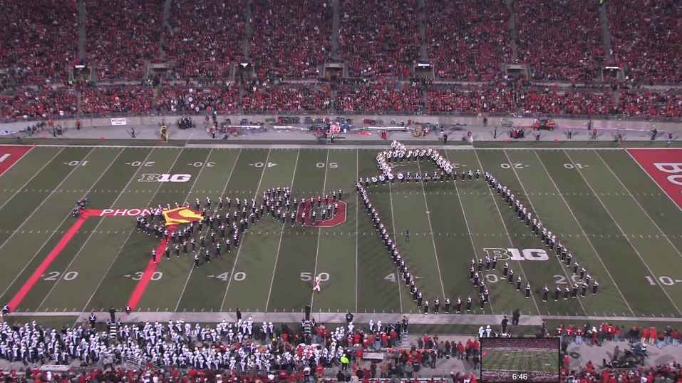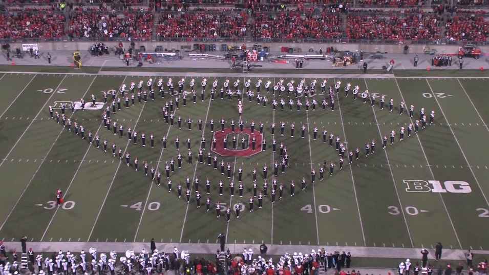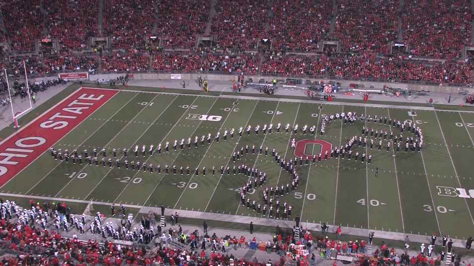 Pendant la mi-temps d’un match de football américain opposant deux universités, L’Ohio et la Pennsylvanie, la fanfare de l’Ohio State University a réalisé différentes chorégraphies sur le thème du cinéma et des blockbusters américains. (Superman, Harry Potter, Jurassic Park et Les Pirates des Caraïbes)
