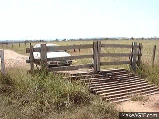 Le poids de la voiture déclenche un mécanisme qui lève les battants du portail. La voiture passe et le portail redescend. Le plancher est ajouré pour empêcher le bétail de passer.