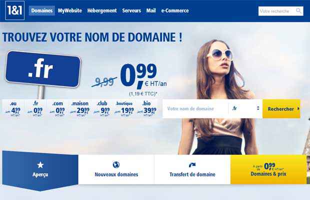 Si vous cherchez à acquérir un nom de domaine en .fr ou en .com j’ai un bon plan pour vous. La société d’hébergement Web 1&1 propose actuellement une offre défiant toute concurrence.